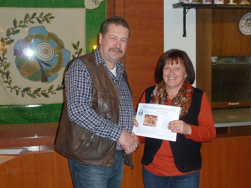 Der 1. Schützenmeister Schmid Hermann gratulierte der Siegerin und überreichte ihr den Wertgutschein in Höhe von 50 Euro. |